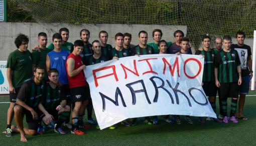 LOS COMPAÑEROS DE MARKO DESPLEGARON UNA PANCARTA DE ANIMO HA MARCO RASCON,QUE HA DE SER OPERADO DE SU RODILLA. GORENGOEN MAILAKO JOKALARIAK PANKARTA BAT ETARA ZUTEN TOLOSAREN AURKAKO PARTIDOAN MARKO RASKONERI ANIMOAK EMAN NAHIAN.